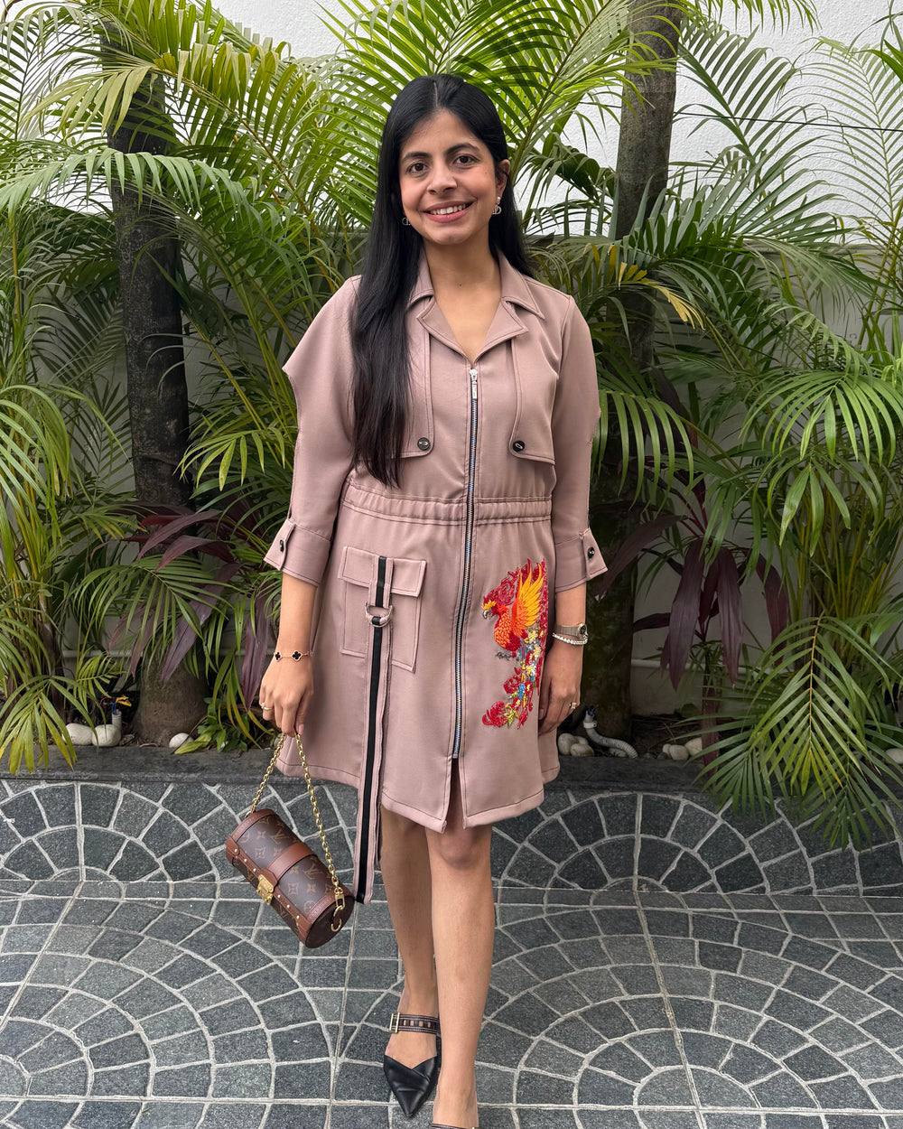 Relaxed fit knee length dress with blazer collar and front metal zip