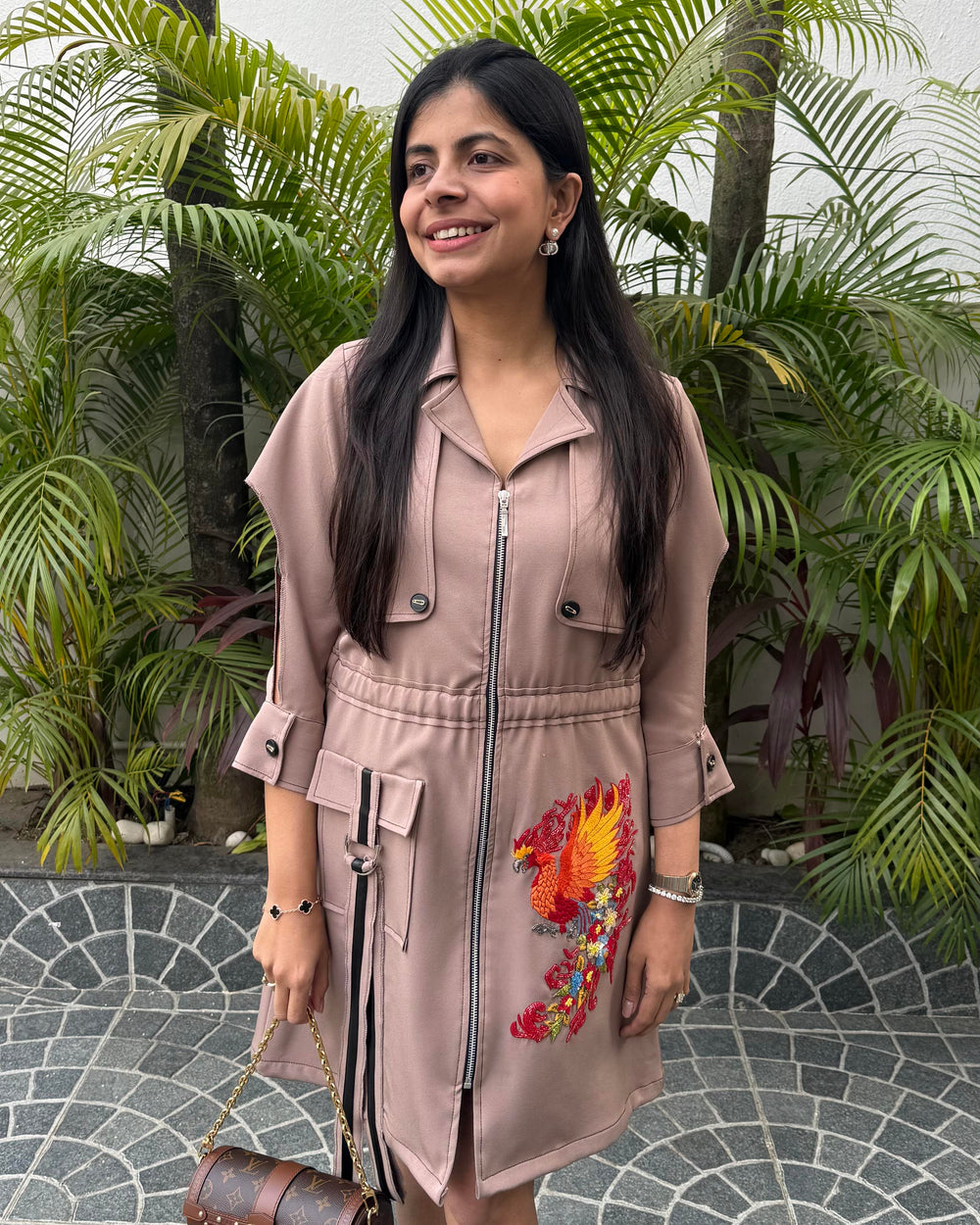 The embroidery portrays a phoenix mid-burn, gradually transforming into flowers. This HYBRID form captures a moment where endings and beginnings coexist.