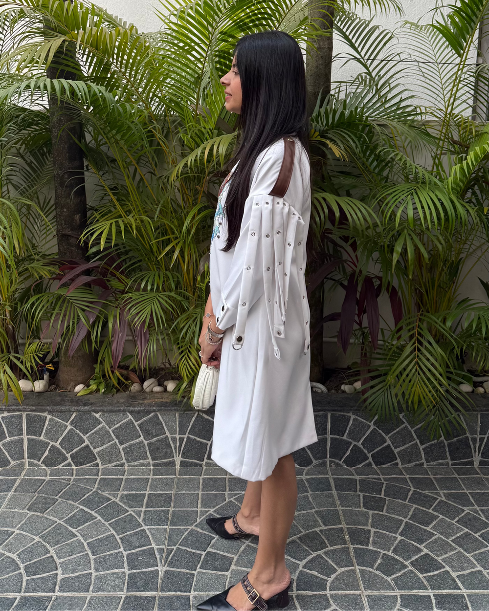 Drop shoulders, leather flap on shoulder, hangings with metal rings, buttons, eyelets